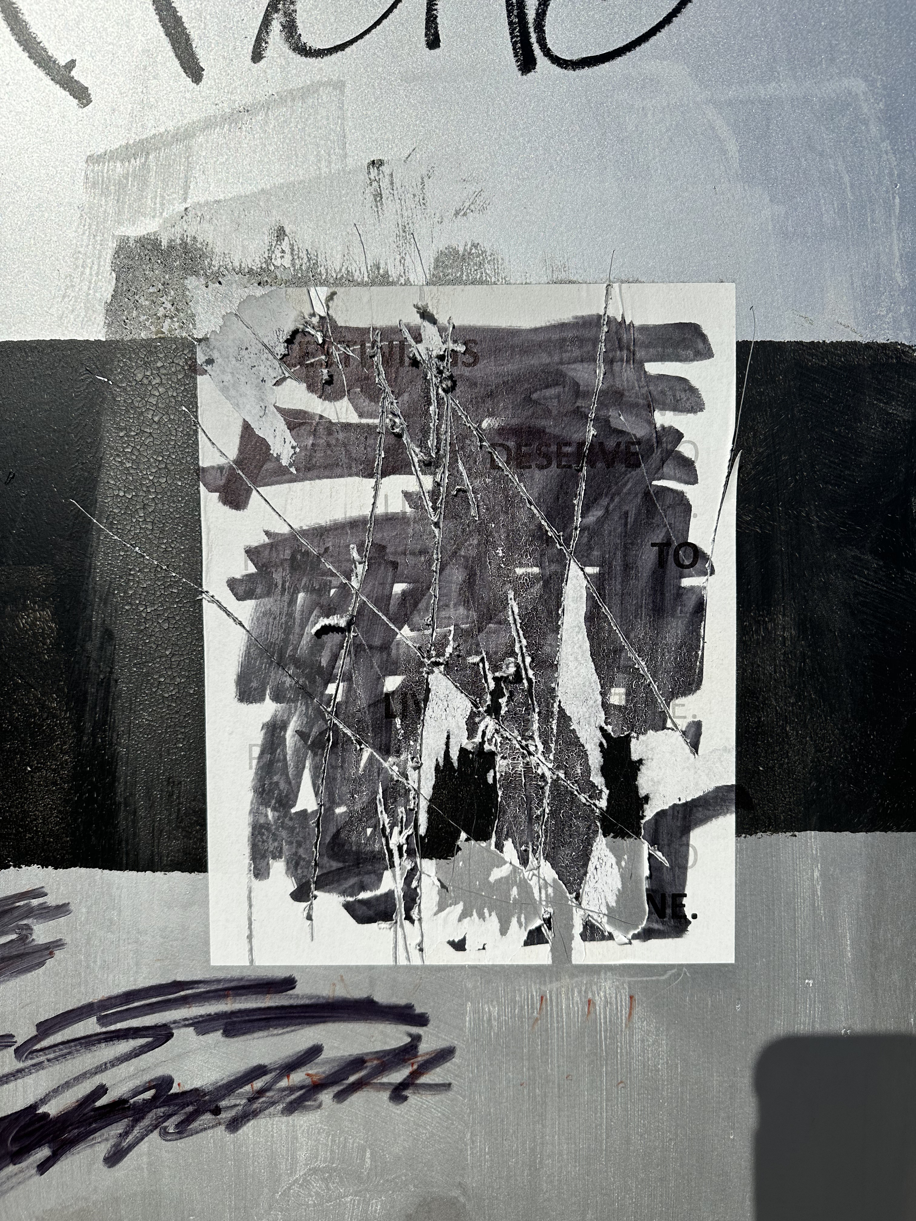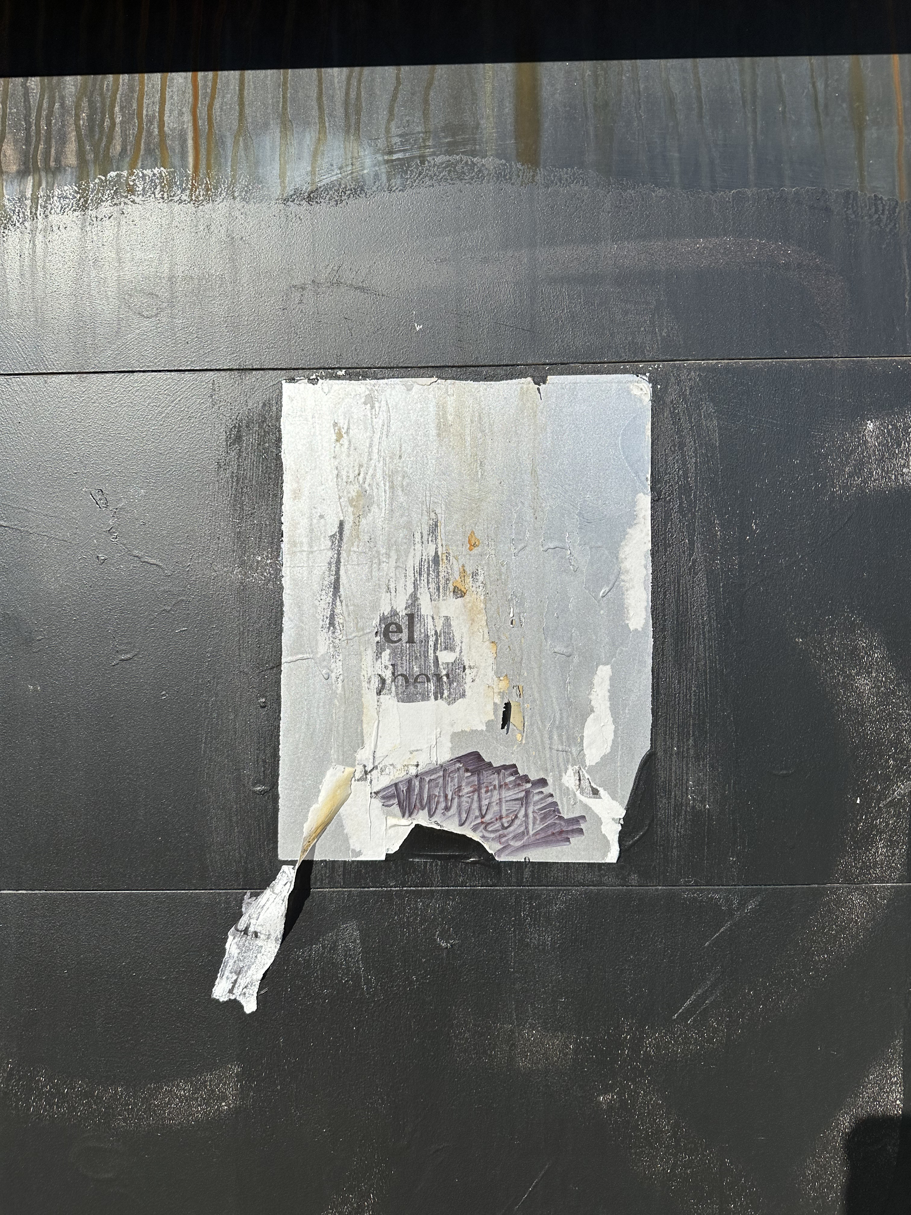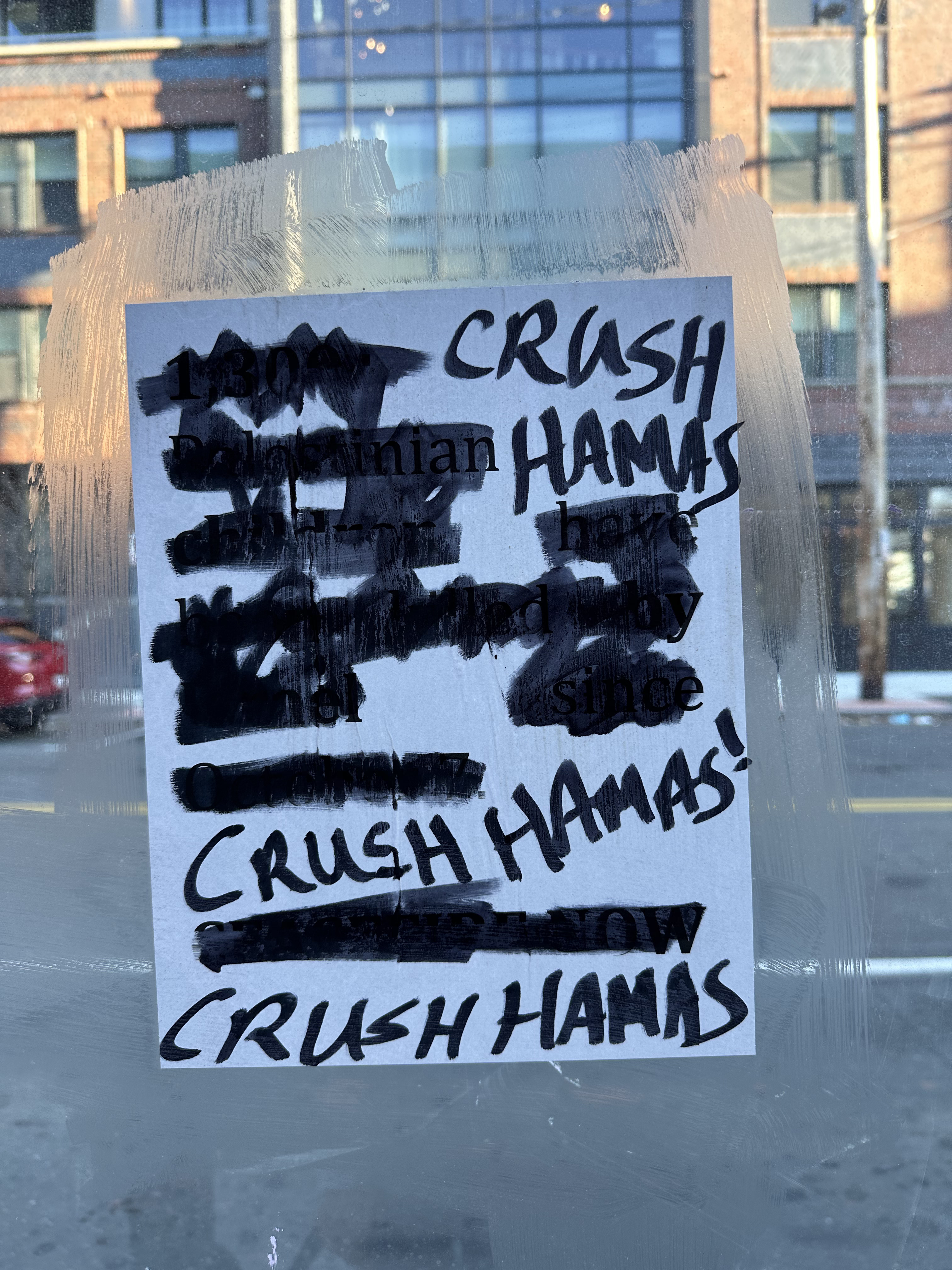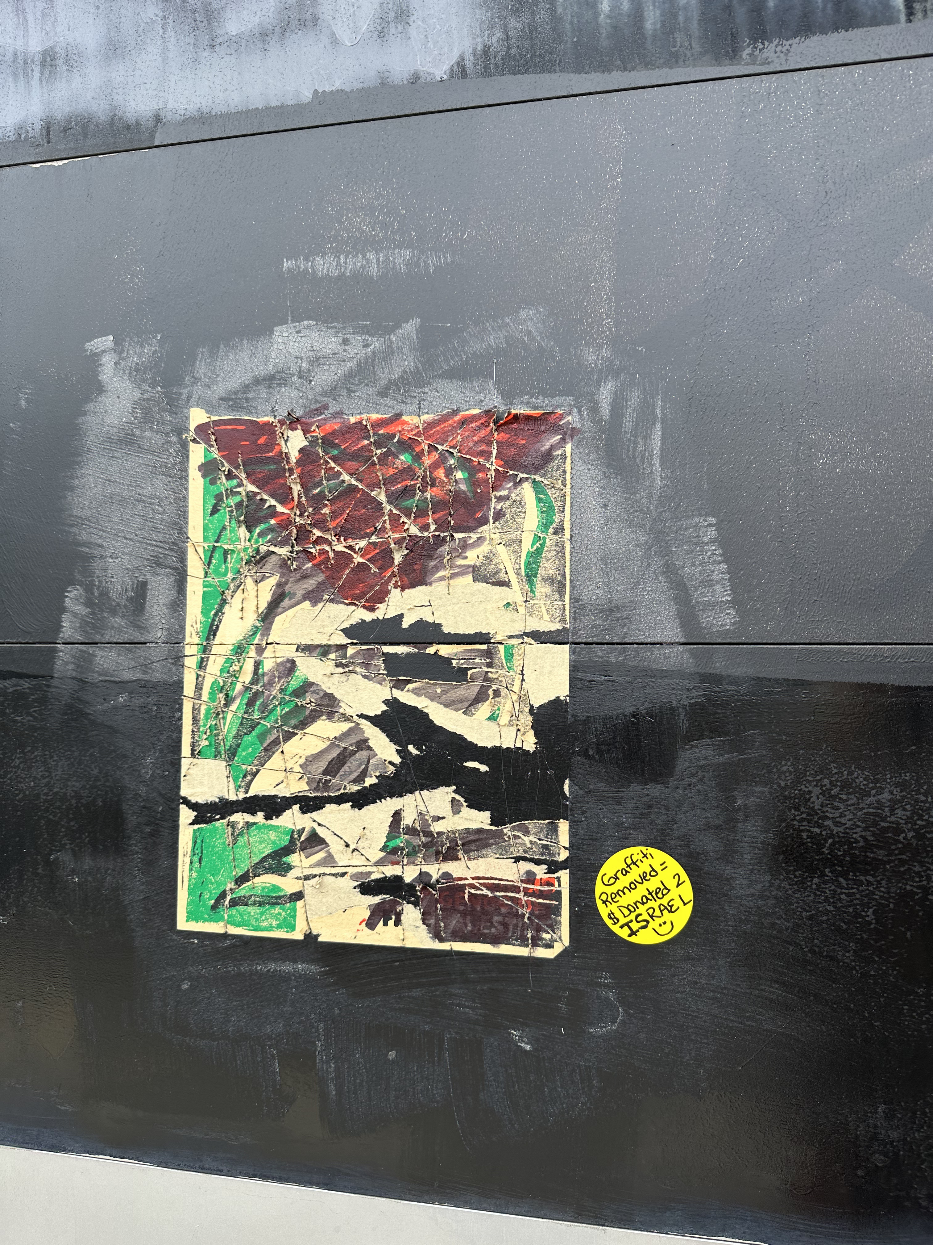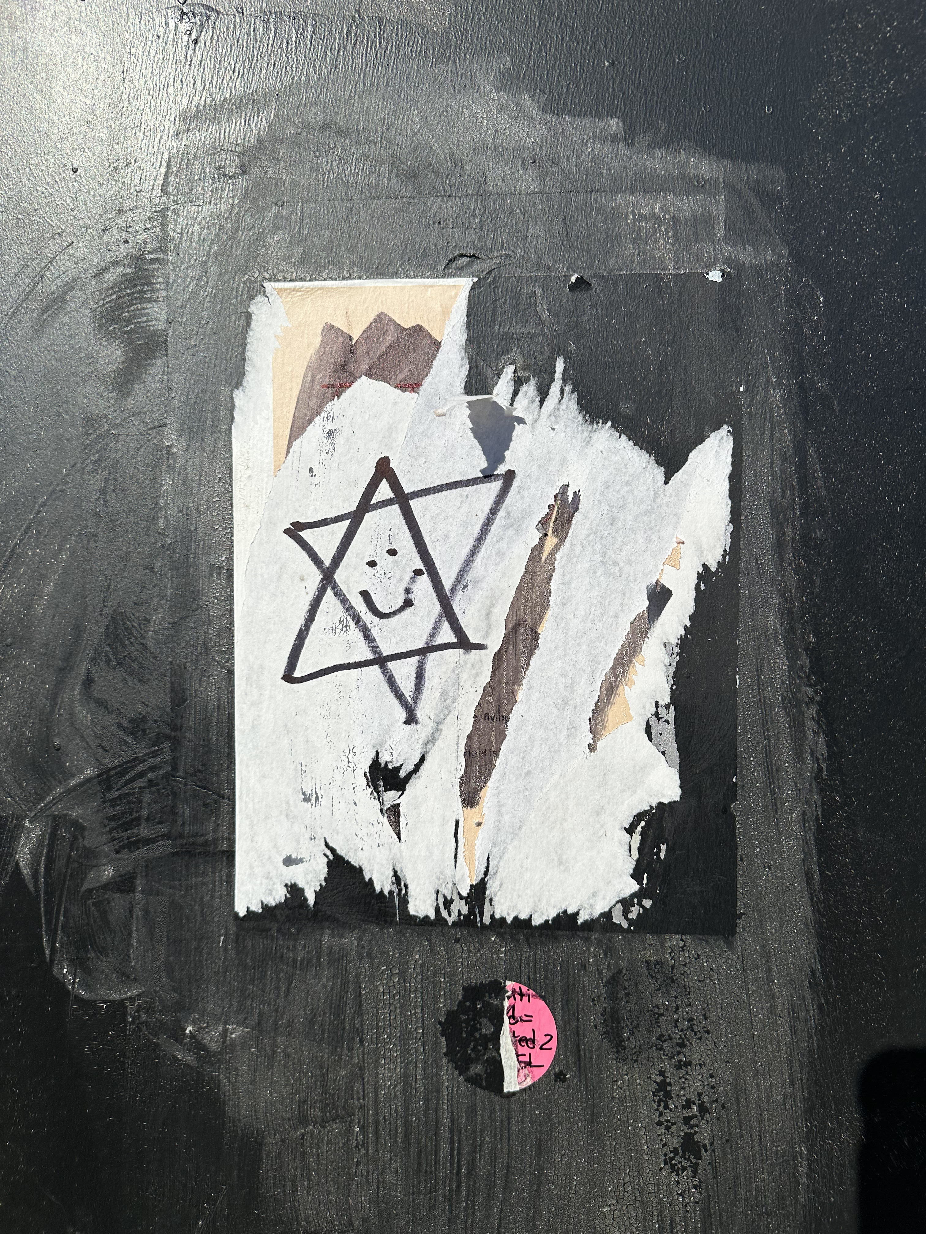 A day or two after my friend and I put up posters in my neighborhood, as soon as the glue dries, someone, a neighbor, comes around with a black marker. She (others have spotted her) blacks out the words and images like someone redacting court documents. Toward the start of the genocide, she drew little hearts to accompany her work. Now, she draws stars of David with smiley faces in the middle. She peels off what she can, but the wheatpaste (just flour and water) is strong. Now, she brings a razor.